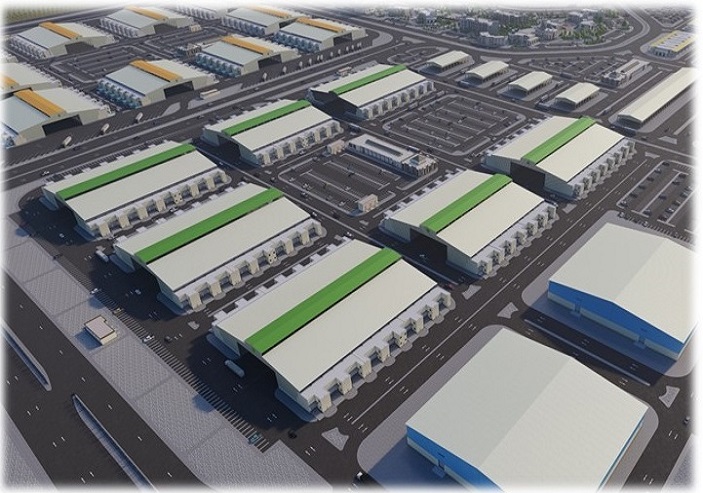 The unit is divided into shops, each featuring loading and unloading zones, with large product display areas, dedicated offices, and rooms.
